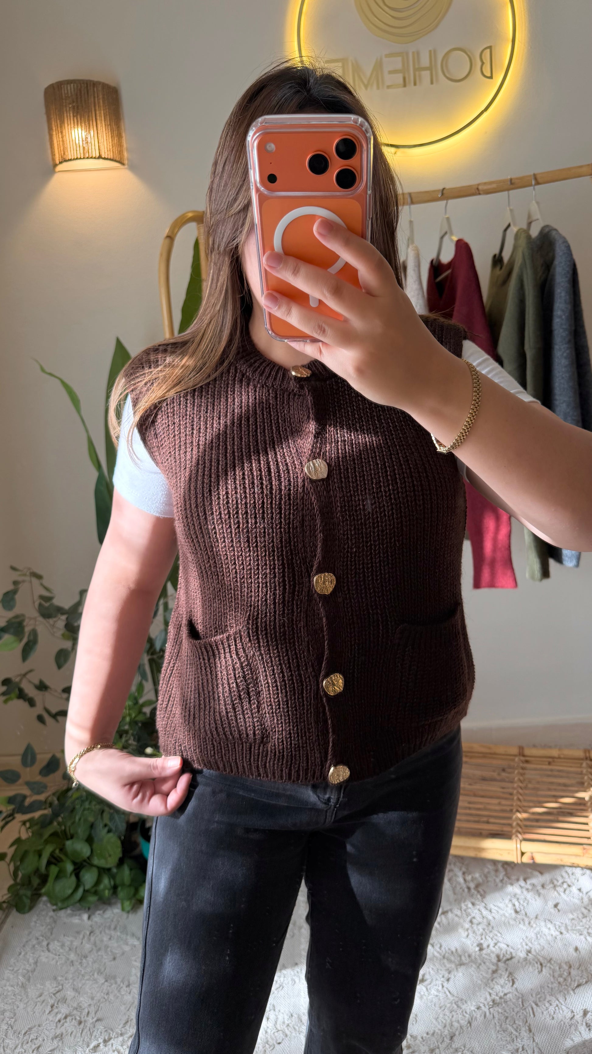 Brown Triko Vest With Pockets & Golden Buttons