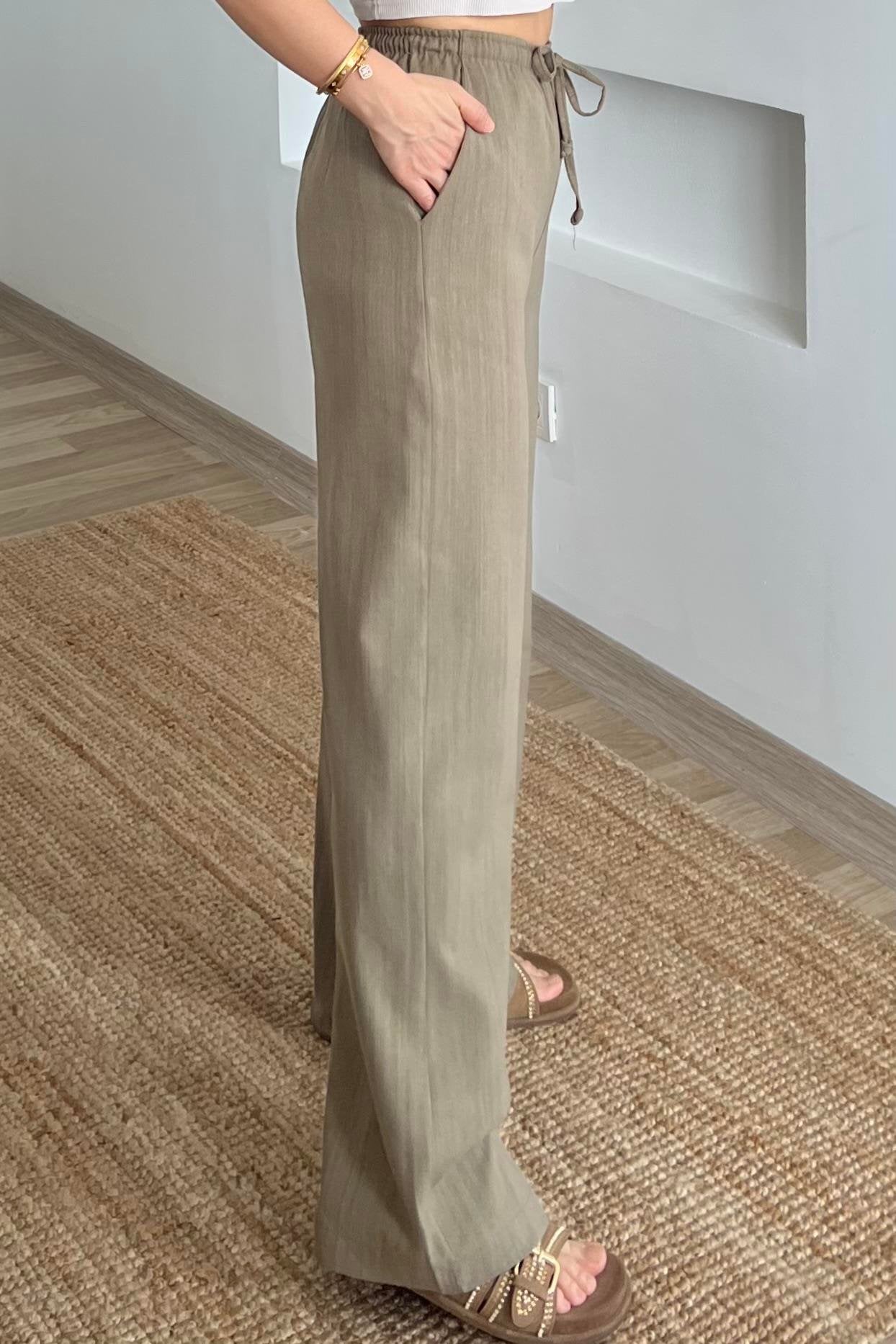 Olive Stripy Linen Straight Leg Pants With Elastic Waist